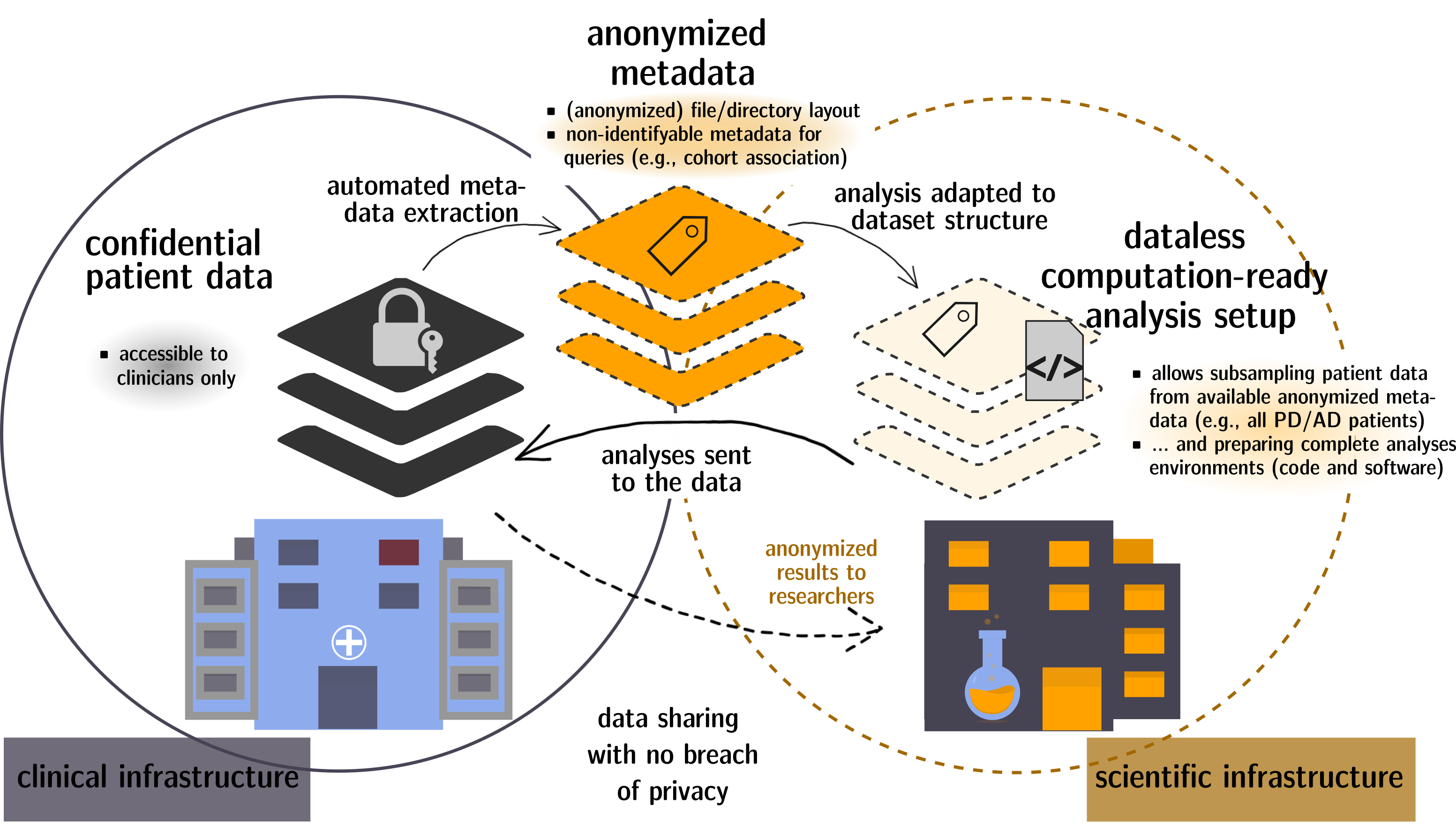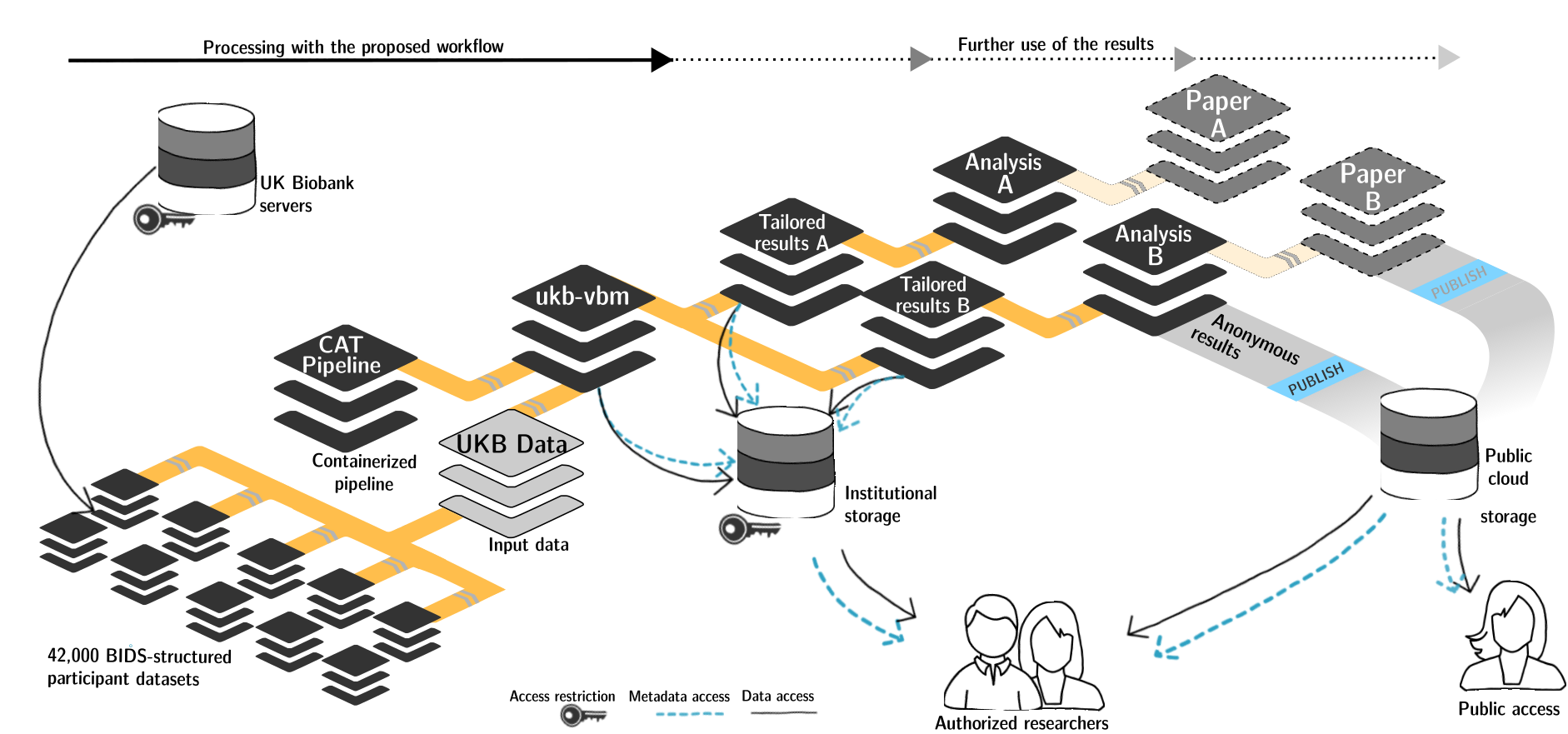 | Data analysis | Reproducibility is threatened by intransparent, multi-stepped analyses¹ & unstable results across software versions². Dataset sizes exceed computational capabilities (e.g., HCP project: ~100TB, 1.2k people). |