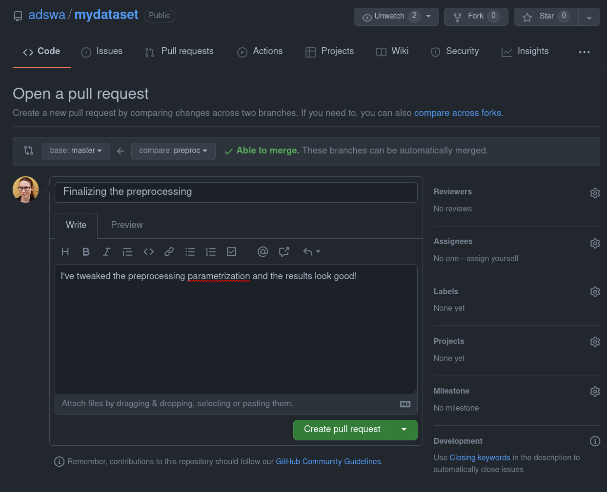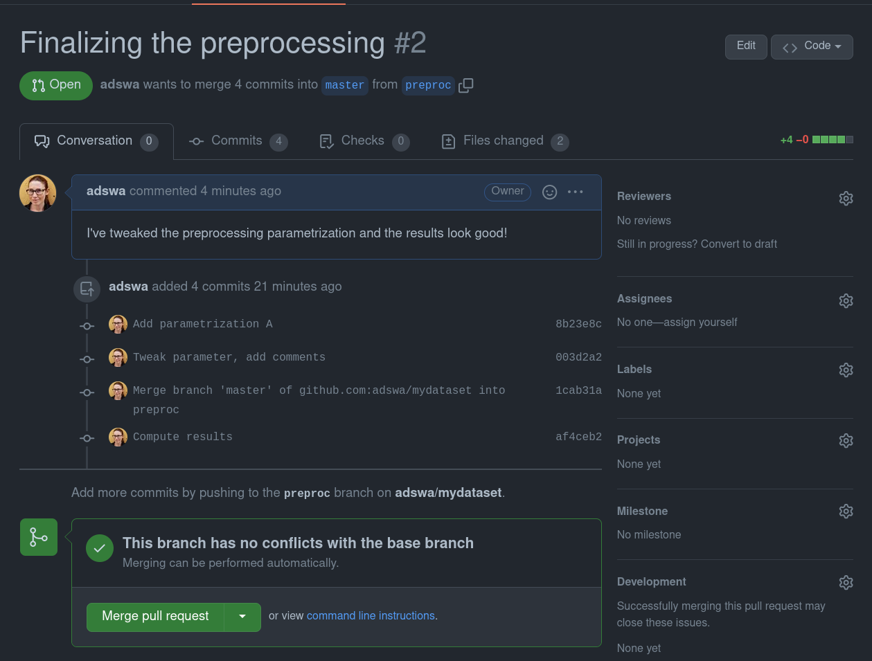 - Transparency - Cleanliness - If sandboxing fails don't merge and your default branch stays orderly - Keep different preprocessing in parallel |